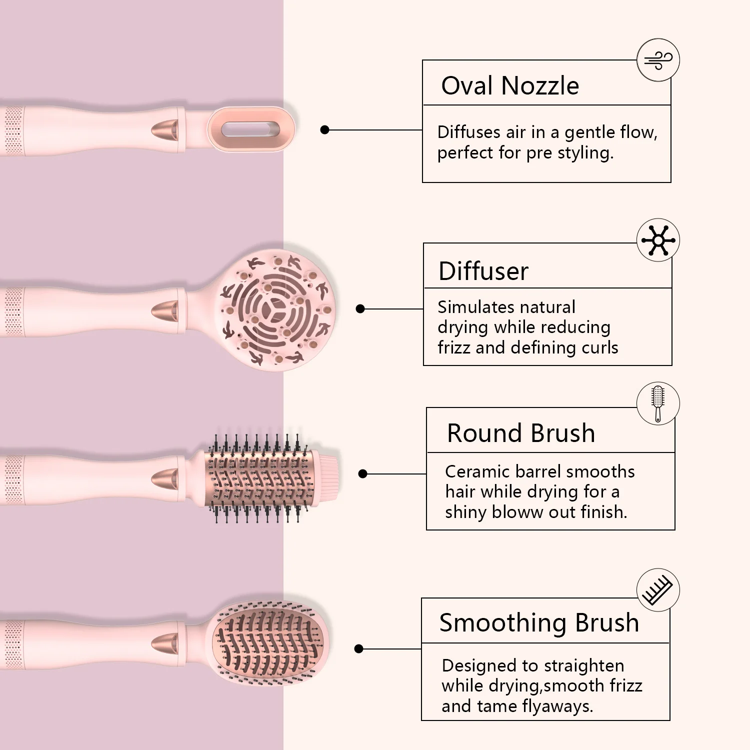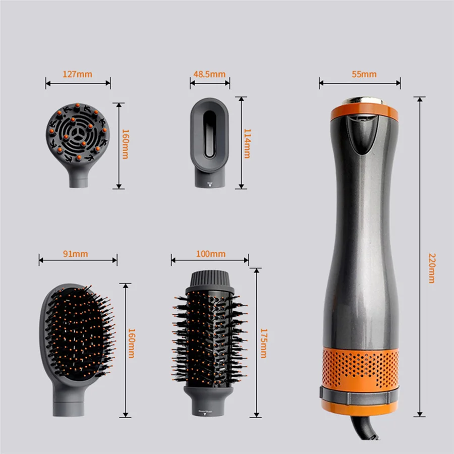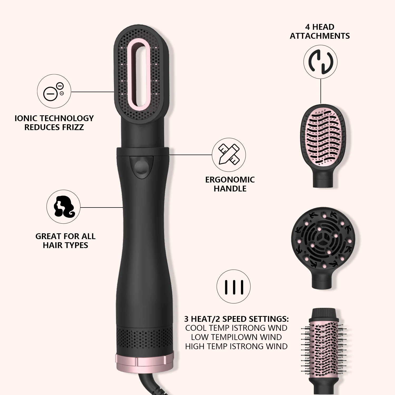 Transform your daily hair styling routine with this professional-grade 4-in-1 hair dryer and volumizer. Delivering 1000 watts of powerful drying performance, this innovative tool combines the functionality of a dryer, brush, straightener, and volumizer in one convenient device. The ionic technology helps reduce frizz and static while adding lustrous shine to your hair. Its ergonomic design features multiple heat and speed settings, allowing for precise styling control.
