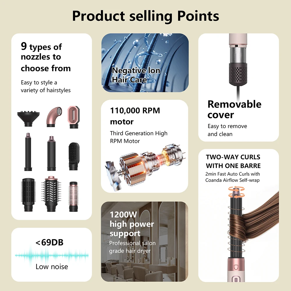 The high-speed airflow combined with multiple attachment heads allows you to dry, straighten, curl, volumize, and style your hair effortlessly. Its ionic technology helps reduce frizz and static while adding shine and protecting hair from heat damage. The ergonomic design ensures comfortable handling, while adjustable temperature and speed settings cater to all hair types and textures. Perfect for creating various hairstyles, this all-in-one styling tool saves both time and space in your beauty routine. Whether you're looking for sleek straight locks or bouncy curls, this multi-functional hair dryer brush is your go-to styling companion.